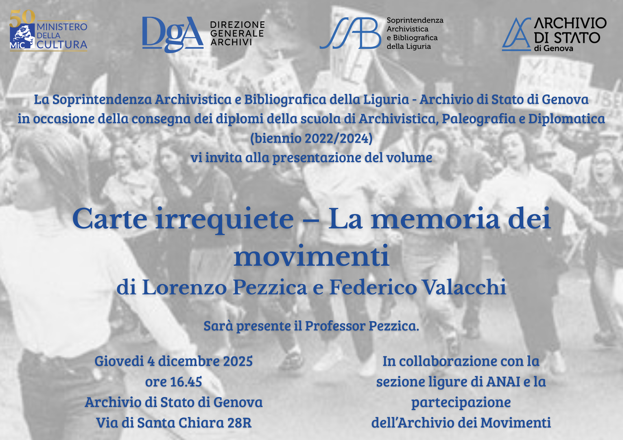 La presentazione è organizzata dalla Soprintendenza Archivistica e Bibliografica della Liguria e dall’Archivio di Stato di Genova, in collaborazione con la sezione ligure di ANAI e con la partecipazione dell’Archivio dei Movimenti in occasione della consegna dei diplomi della scuola di Archivistica, Paleografia e Diplomatica del biennio 2022-2024.